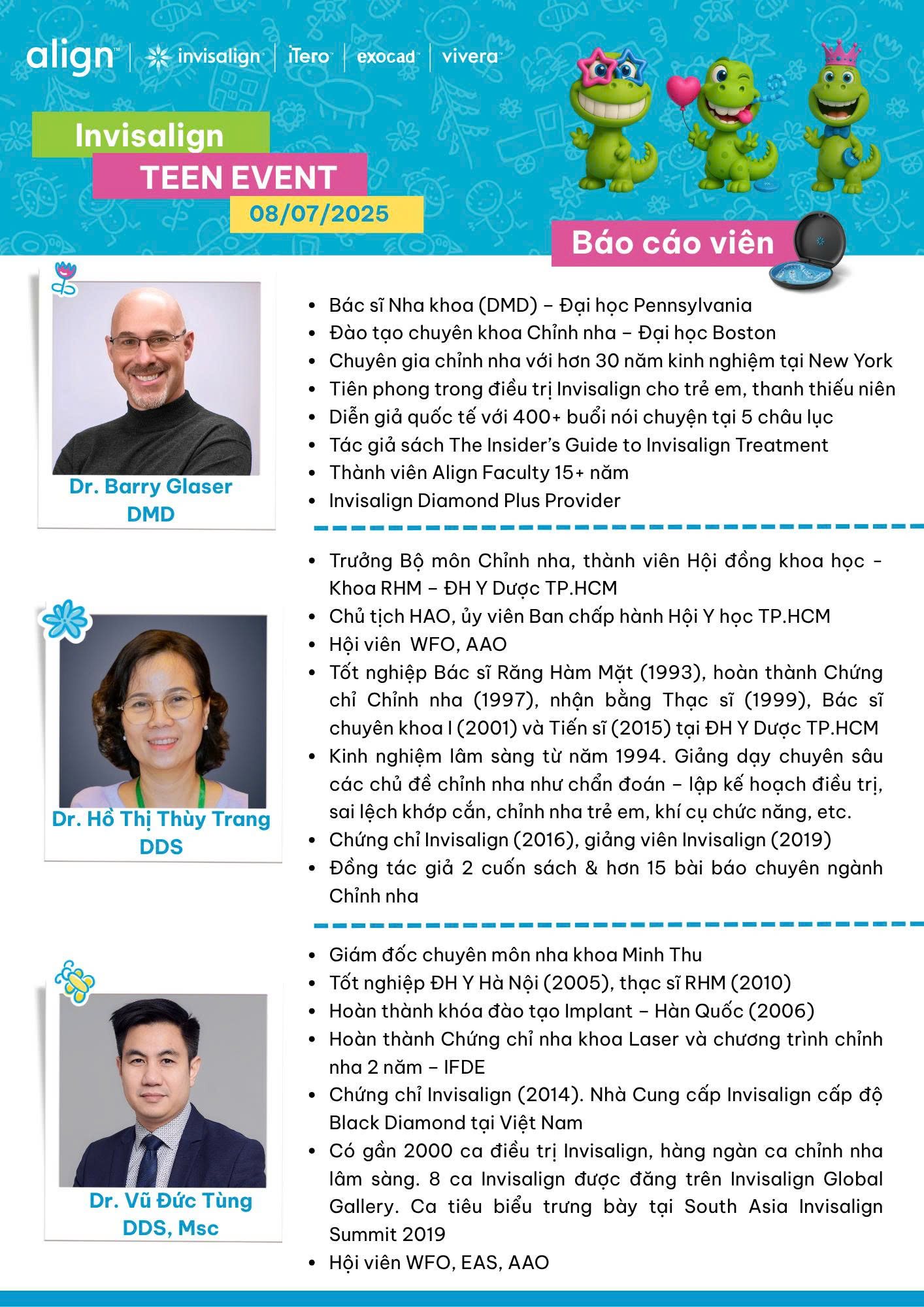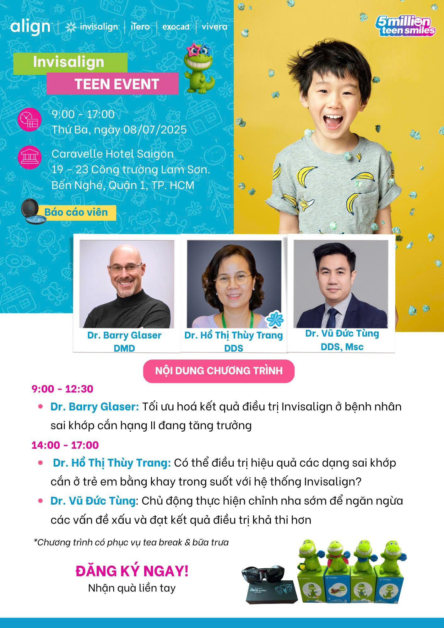 Ngày 8/7 tới đây, trong khuôn khổ Invisalign Teen Event, Bác sĩ Vũ Đức Tùng sẽ báo cáo đề tài “Chủ động thực hiện chỉnh nha sớm để ngăn ngừa các vấn đề xấu và đạt kết quả điều trị khả thi hơn”.