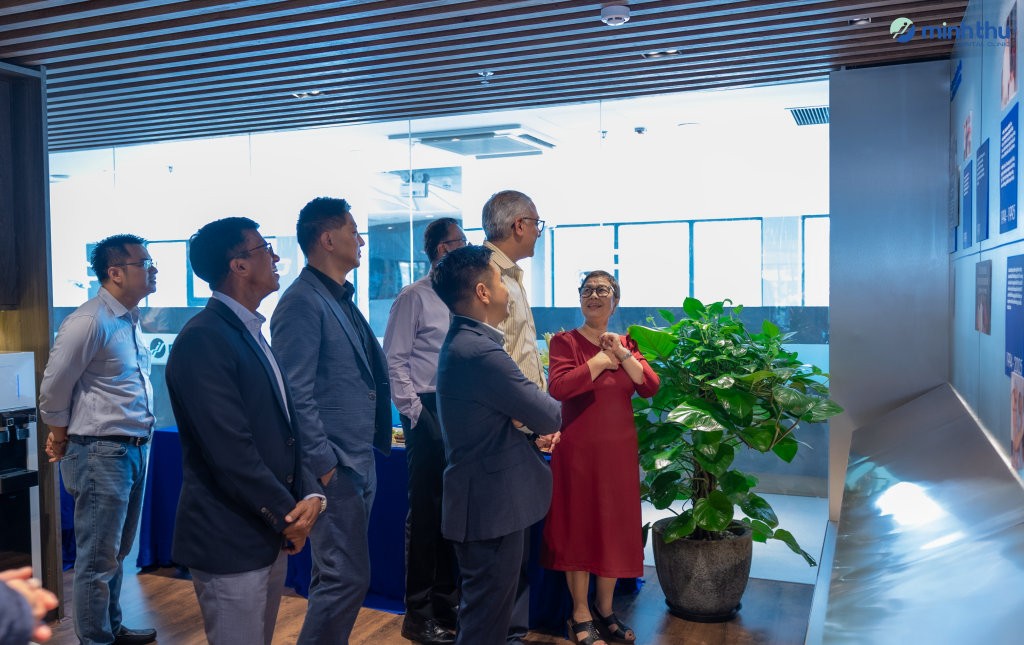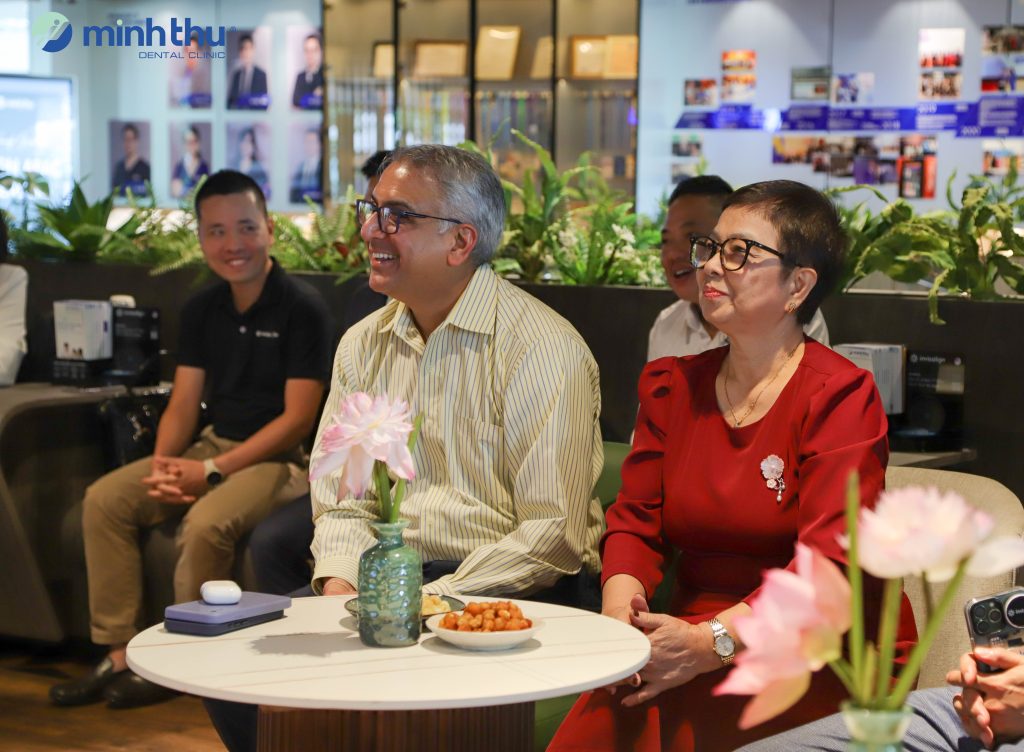 và các thành viên Đoàn khác đã có dịp tham quan không gian kiến trúc độc đáo, trao đổi thân tình với các bác sĩ và đội ngũ nhân viên của Nha Khoa Minh Thu. Không gian hoành tráng hơn 1200m2 của Minh Thu Long Biên khiến các thành viên đoàn cảm thấy choáng ngợp, ông Raj Pudipeddi, chia sẻ rằng đây là phòng khám đẹp nhất và ấn tượng nhất mà ông từng đến thăm.