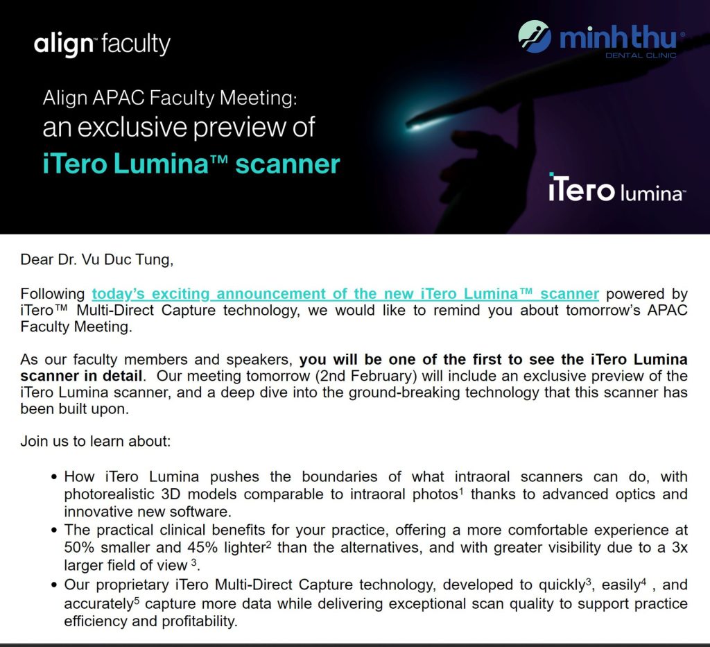 Bác sĩ Vũ Đức Tùng, giảng viên và diễn giả Invisalign, đã nhận được thư mời tham dự buổi ra mắt nội bộ iTero Lumina. Đây là cơ hội tiếp cận sớm những cải tiến mới nhất trong hệ sinh thái Invisalign.