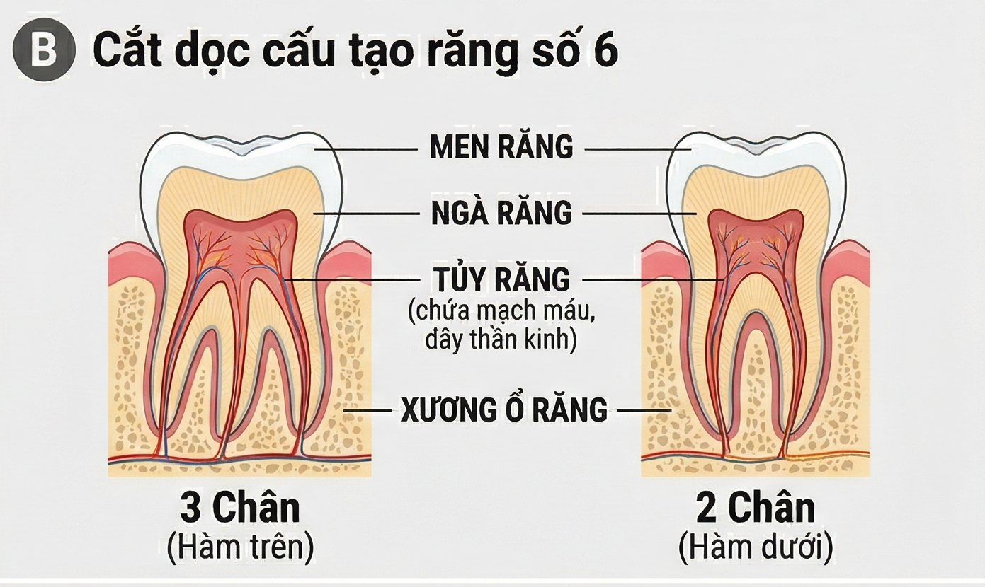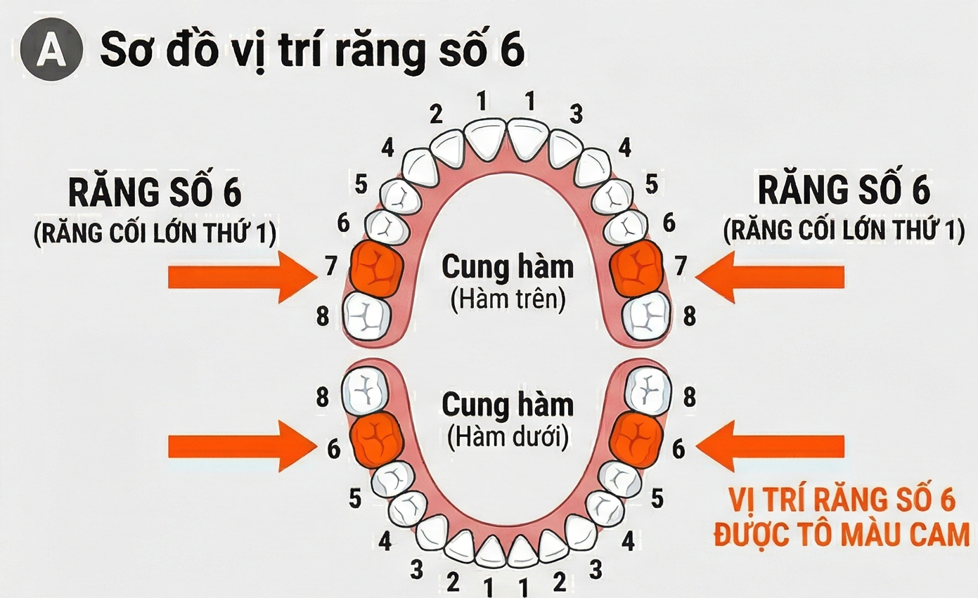 Răng số 6 — hay còn gọi là răng cối lớn thứ nhất — nằm ở vị trí thứ 6 tính từ đường giữa hàm về mỗi phía. Đây là chiếc răng có kích thước lớn nhất trong cung hàm: ở hàm trên có 3 chân răng và 3–4 ống tủy, ở hàm dưới có 2 chân răng và 3–5 ống tủy.