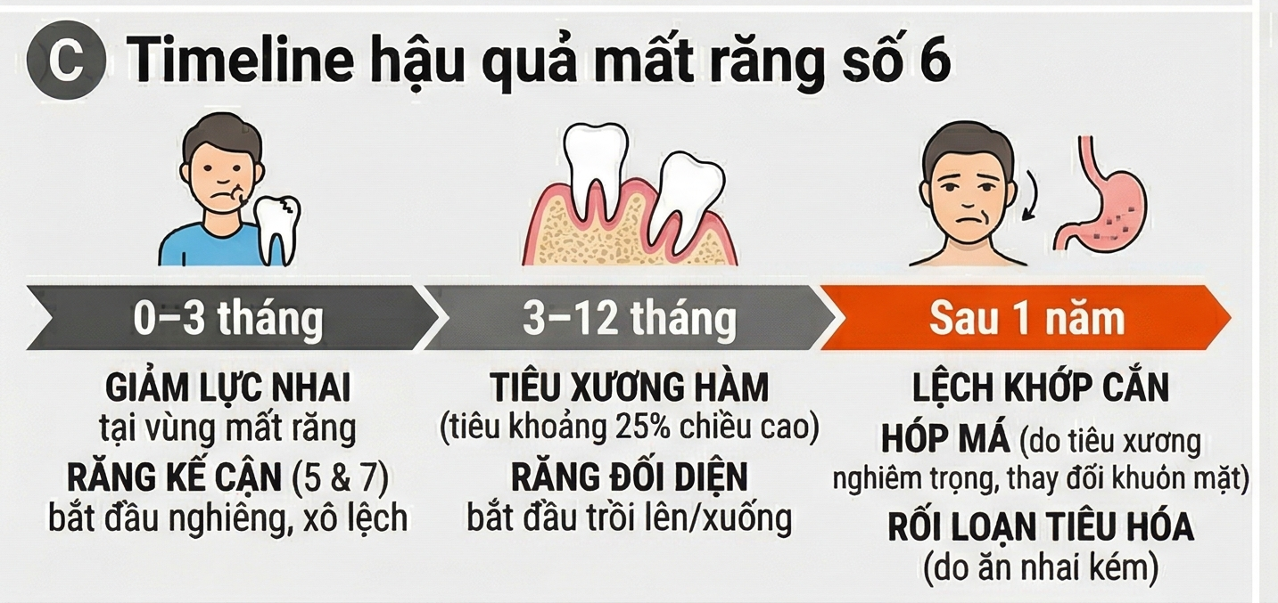 Đây là điều nhiều người không biết: hậu quả của mất răng số 6 không dừng lại ở việc khó nhai — chúng leo thang nghiêm trọng theo thời gian nếu không được xử lý.