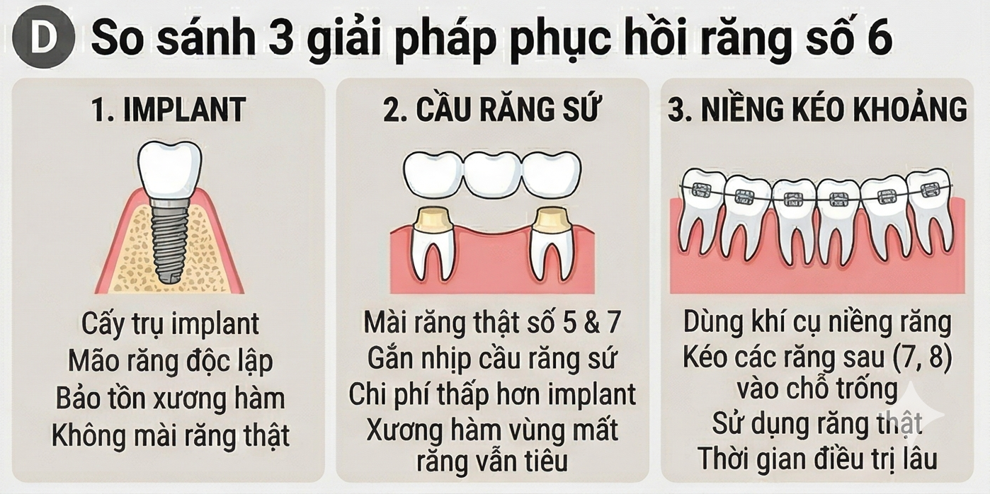 Hiện nay có ba giải pháp chính để phục hồi răng số 6, mỗi giải pháp phù hợp với tình trạng và nhu cầu khác nhau: