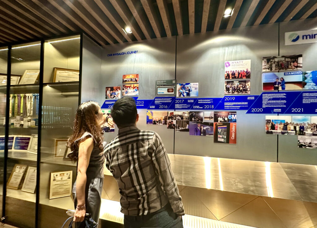 Bức tường Invisalign trưng bày các hộp khay của hơn 1.000 khách hàng Invisalign, thể hiện chiều sâu lâm sàng và số lượng ca điều trị thực tế