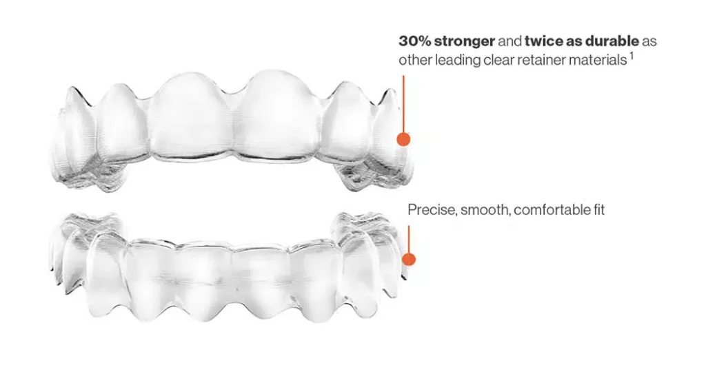 Khác với khay điều trị Invisalign sử dụng vật liệu SmartTrack, Vivera được sản xuất từ vật liệu EX30/EX40, có độ dày và độ bền cao hơn, phù hợp cho giai đoạn duy trì lâu dài.