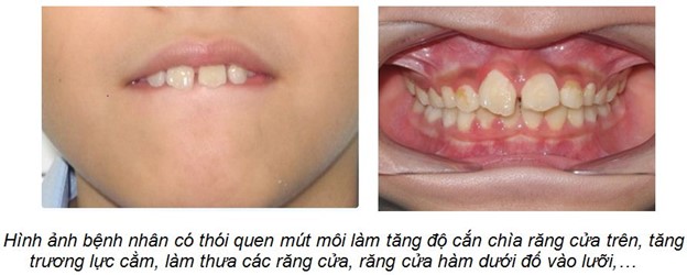 Cha mẹ có thể dễ dàng nhận thấy tình trạng môi nằm giữa răng cửa 2 hàm, môi có in dấu răng, môi dưới thường xuyên ướt. Trẻ có thói quen mút môi thường gây ra lệch lạc: Các răng cửa trên ngả trước, thưa nhau, răng cửa dưới ngả trong, cắn vào vùng lợi ở mặt trong răng cửa trên, khấp khểnh vùng răng cửa dưới, khớp cắn sâu